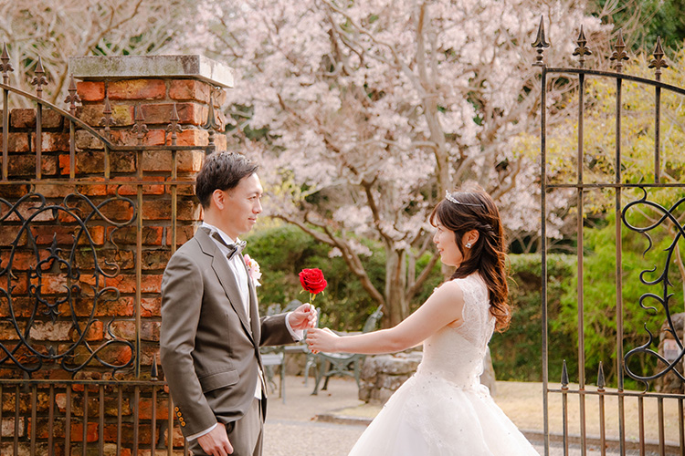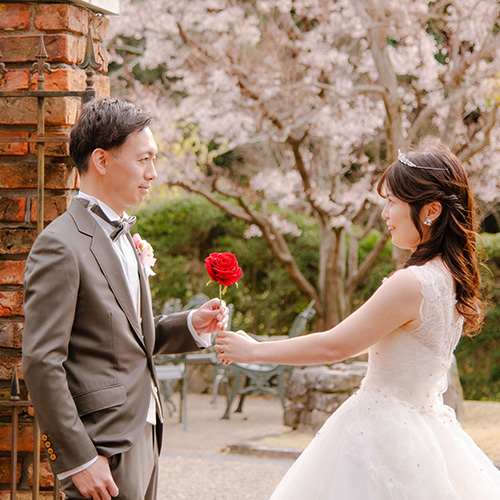 ロケーション撮影、新郎新婦⾐裳(各1点)、新婦ヘアメイク、台紙付き写真1枚、アクセサリー・ブーケ・ブートニア、撮影⼩物