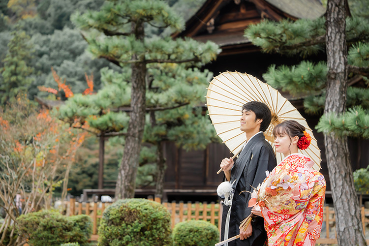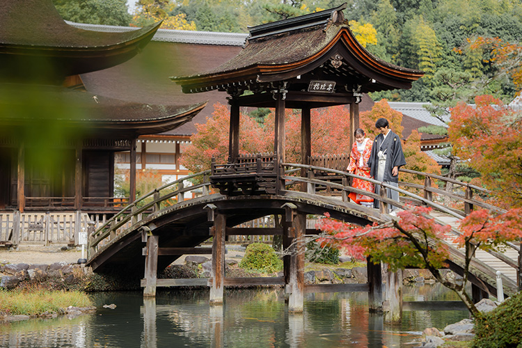 重厚な国宝の建築物や、池・岩山・橋が調和した趣深い日本庭園は和装姿を引き立てます。