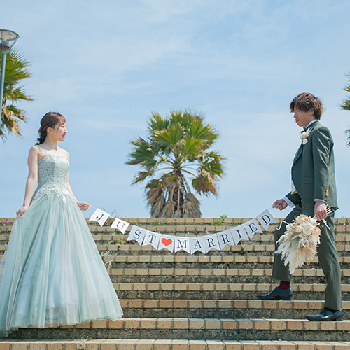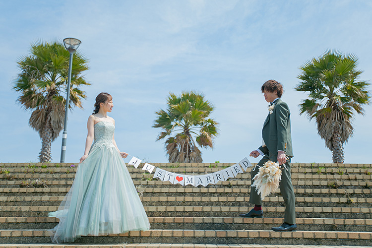潮風がここちよい綺麗に整備された海の施設。洋装でのロケーション撮影がおすすめ。