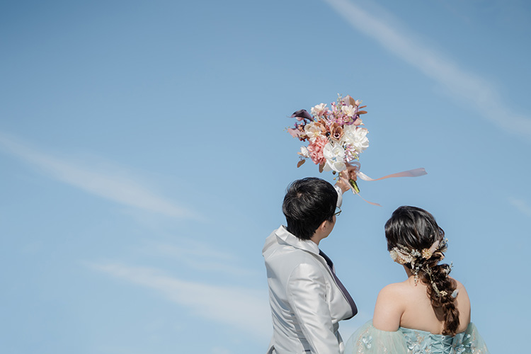 ロケーション撮影、新郎新婦⾐裳(各1点)、新婦ヘアメイク、台紙付き写真1枚、アクセサリー・ブーケ・ブートニア、撮影⼩物