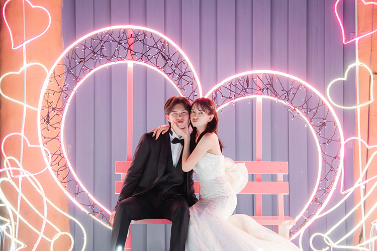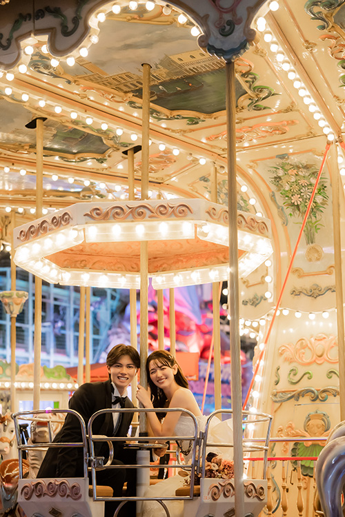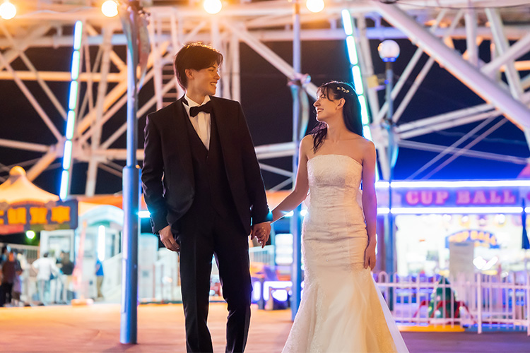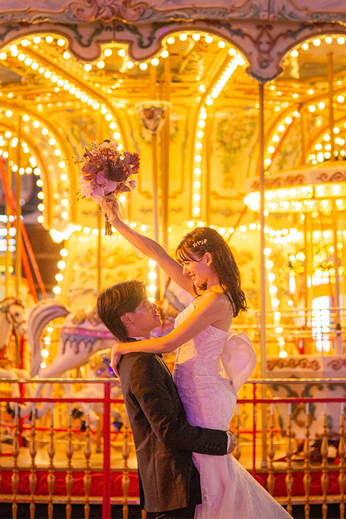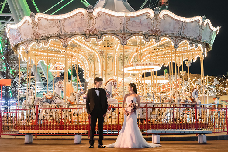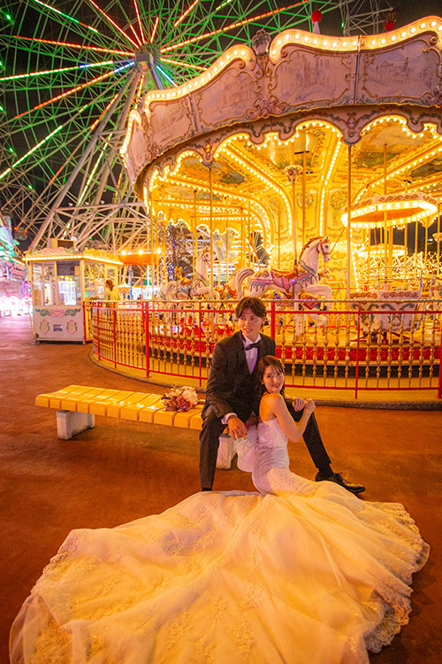 ライトアップされた観覧車やキラキラ輝くメリーゴーランドは、非日常の世界でドラマチックな雰囲気を演出できます。