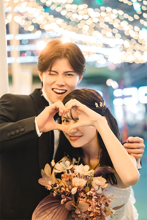 ロケーション撮影、新郎新婦⾐裳(各1点)、新婦ヘアメイク、台紙付き写真1枚、アクセサリー・ブーケ・ブートニア、撮影⼩物